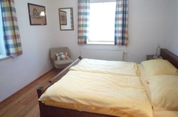 - ein Schlafzimmer mit Doppelbett und Schrank
